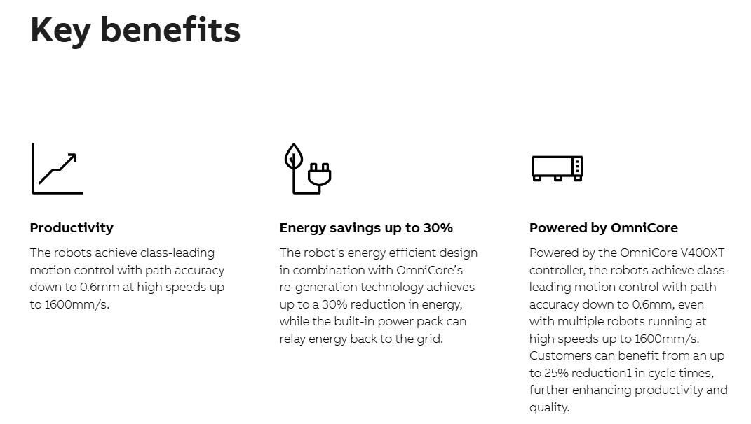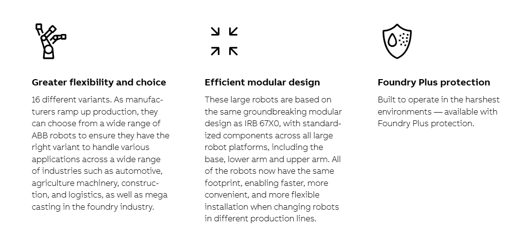 Target applications are high-payload assembly and handling, such as giga casting, EV batteries, foundry parts, and cabins. High-speed press tending and palletizing, such as car doors, frames, boxes, and pallets as well as high-accuracy contact applications, such as machining and friction stir welding.