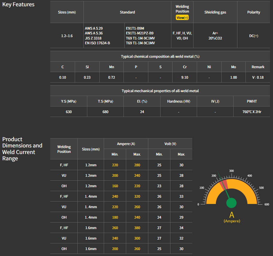 For 650Mpa Grade 9%Cr-1%Mo-V Heat resisting steel, Arc is stable with 20%CO2+75%Ar gas. Spatter is very low. Slag removal is excellent. Bead appearance is good