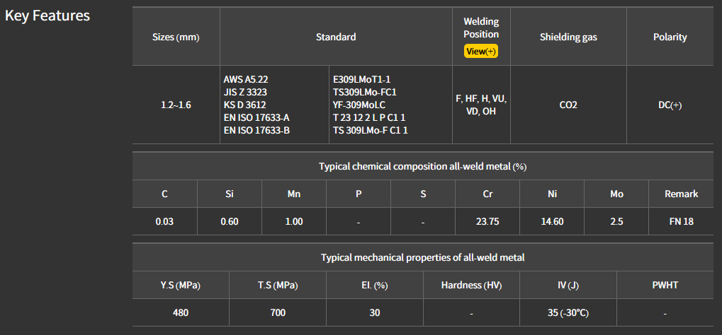 - EN: ISO 17633-B : TS 309LMo-F C1 1