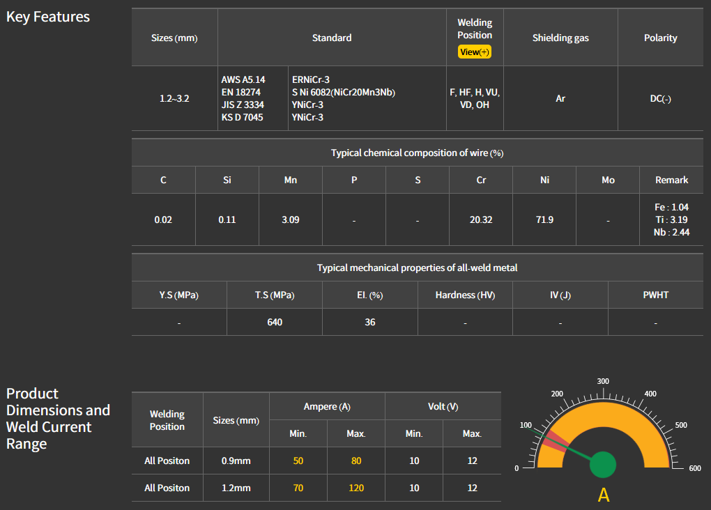 Inconel 600, Incoloy 800(HT). (ASTM B 163, B166, B167 or UNS N06082). The weld metal has high strength and good corrosion resistance at elevated temperature