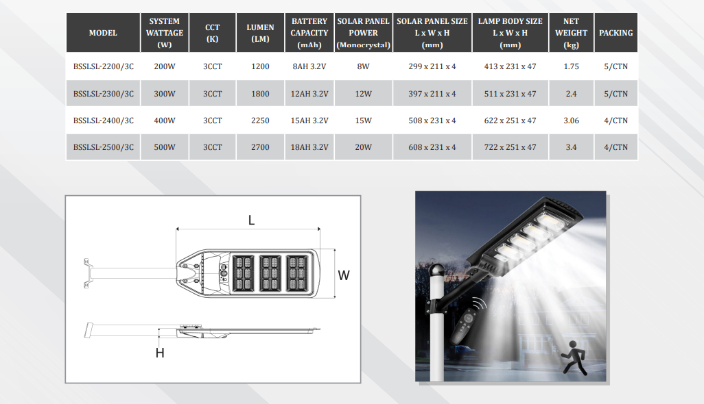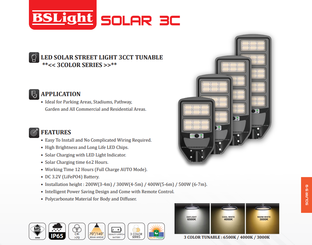 BSLIGHT 3 COLOUR SERIES TUNABLE LED SOLAR STREETLIGHT 3CCT IP65 CRI70 [200W/300W/400W/500W] [1200LM/1800LM/2250LM/2700LM] [70D/140D]
