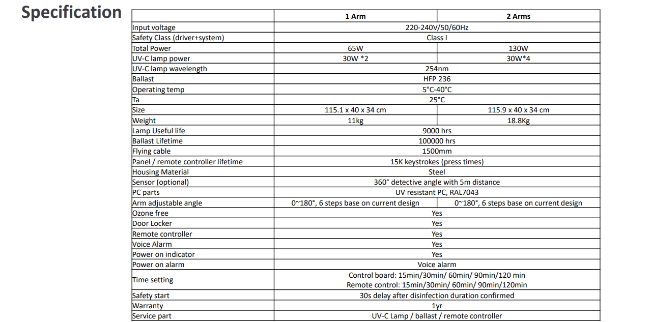 65W (1-arm) and 130W (2-arm) options