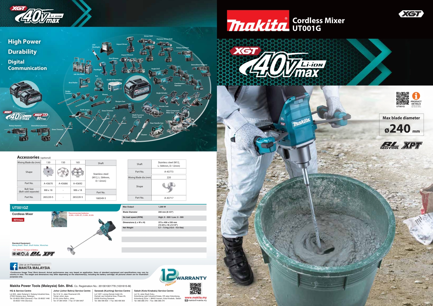 Model : MAKITA 40Vmax Cordless Mixer UT001GZ Without Battery & Charger