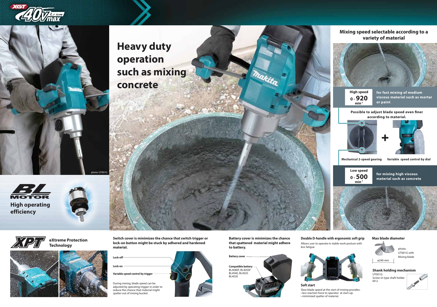 Equipped with XGT battery and BL motor, plus redesigned gear structure for heavy duty operation such as mixing concrete