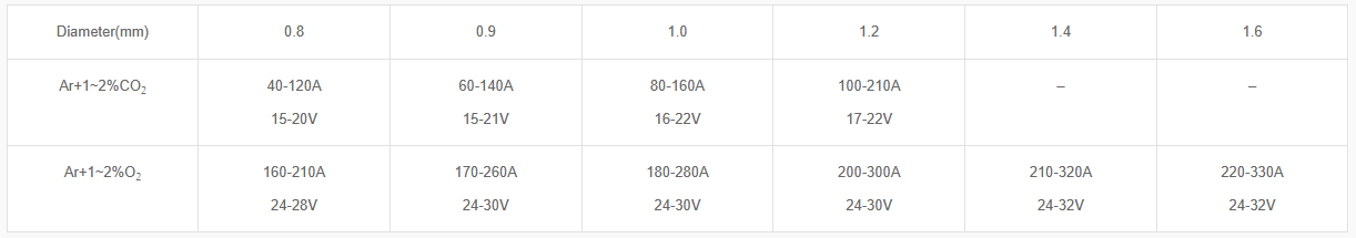- Use Ar+1~2%O2 for spray transfer and Ar+1~2%CO2 for short-circuit transfer.