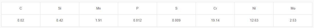 - The weld metal has a low-carbon austenitic structure containing 18.5% Cr, 12.5% Ni, and 2.5% Mo