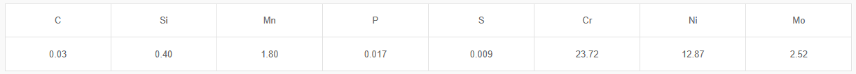 The weld metal has a low-carbon austenitic structure containing 23.5% Cr, 13% Ni, and 2.5% Mo