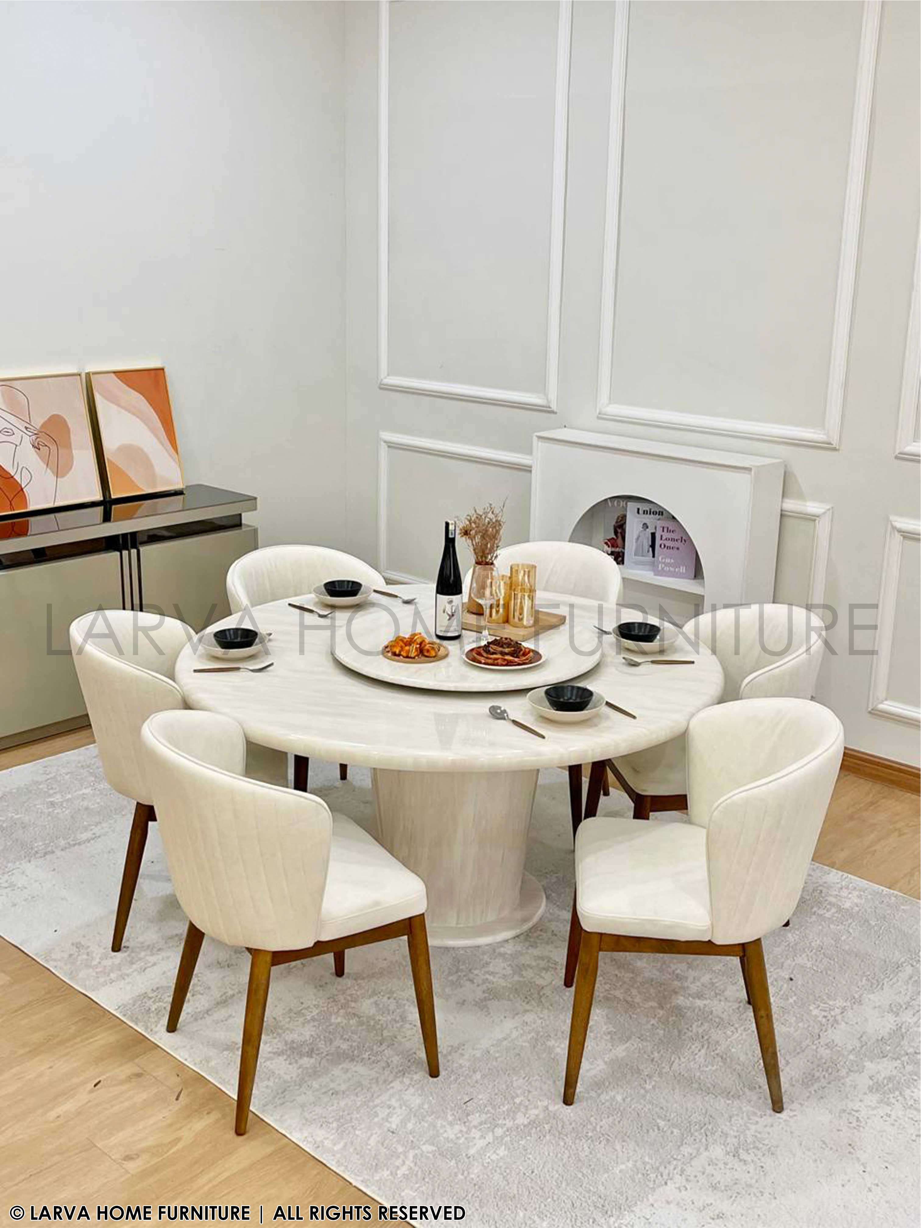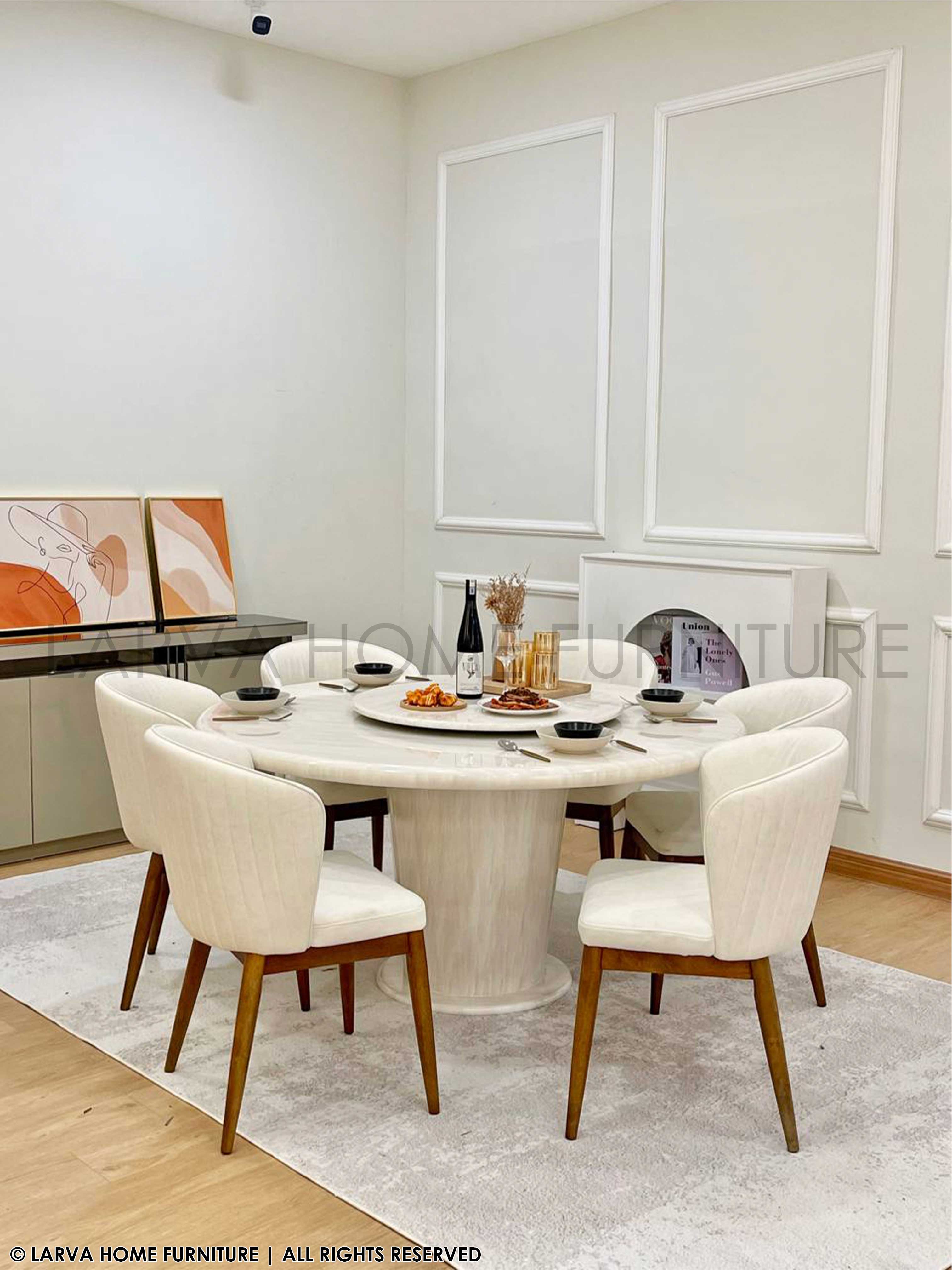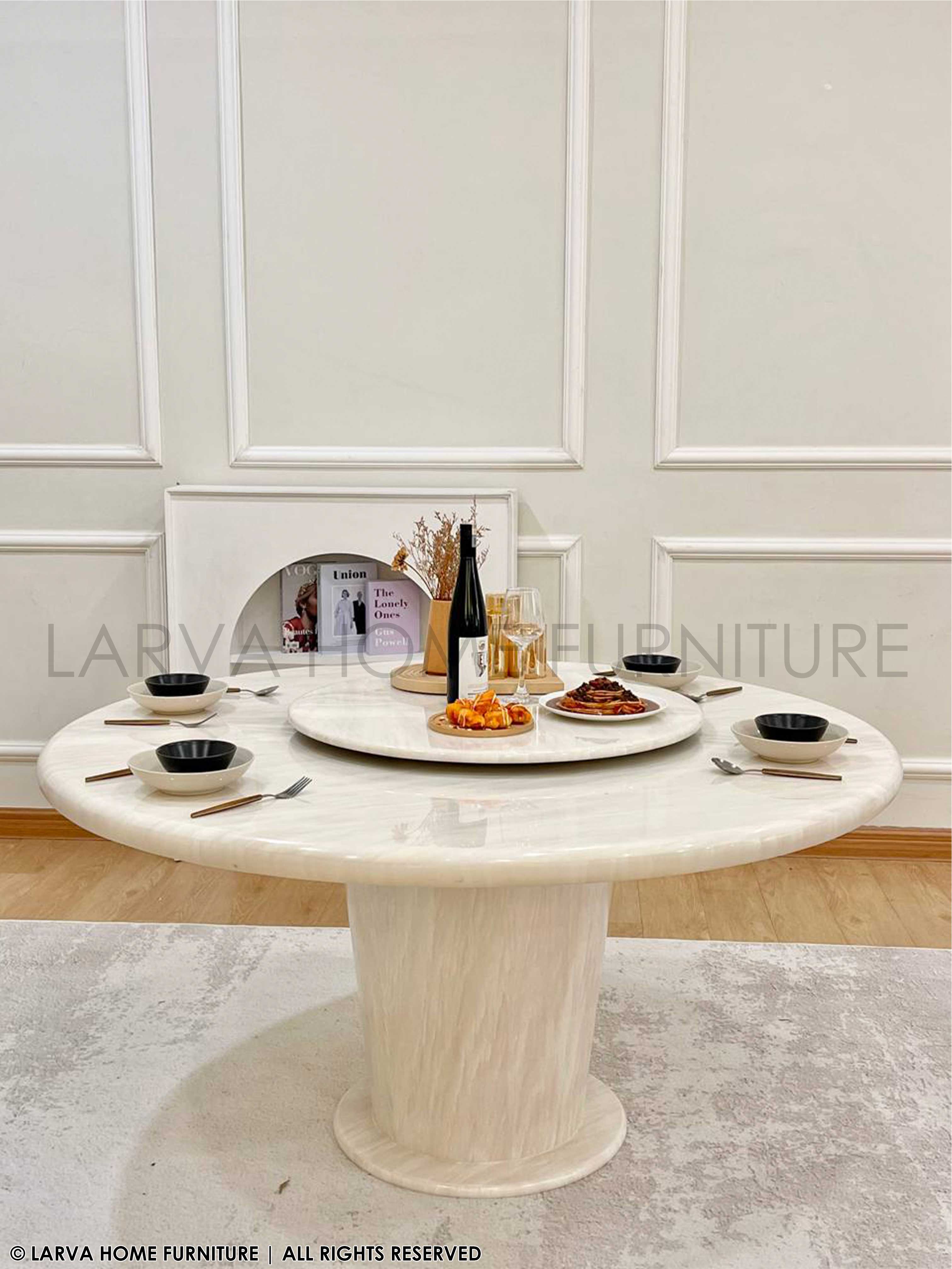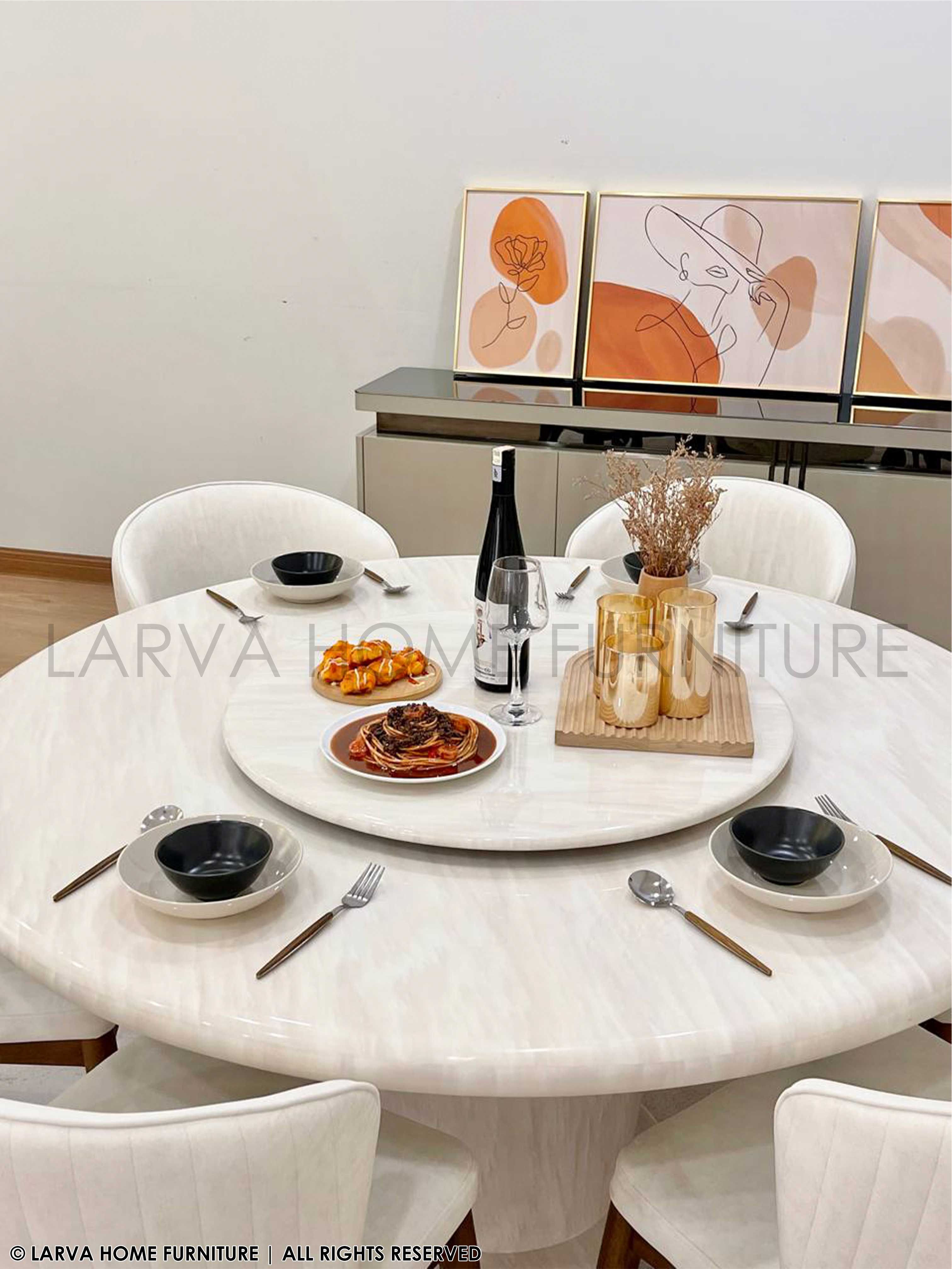 A statement of elegance and modern refinement, this marble Glays Dining Table brings a touch of luxury to any dining space. Its beautifully polished marble tabletop rests atop a solid pedestal base, creating a perfect balance between strength and sophistication. The natural veining of the marble adds a unique character and timeless charm, making every piece one of a kind. Ideal for contemporary or minimalist interiors, this table transforms everyday meals into a refined dining experience, blending durability with effortless beauty.