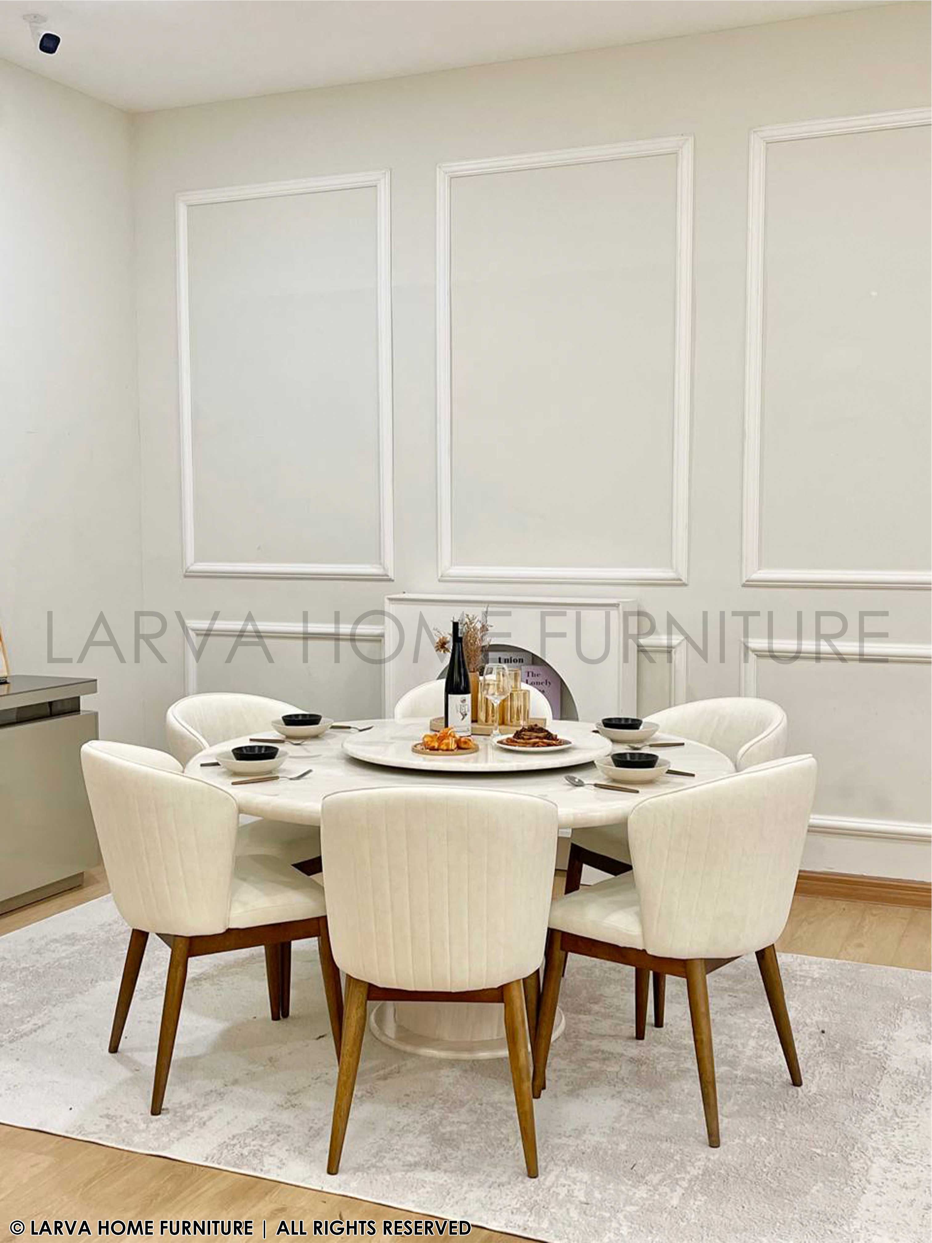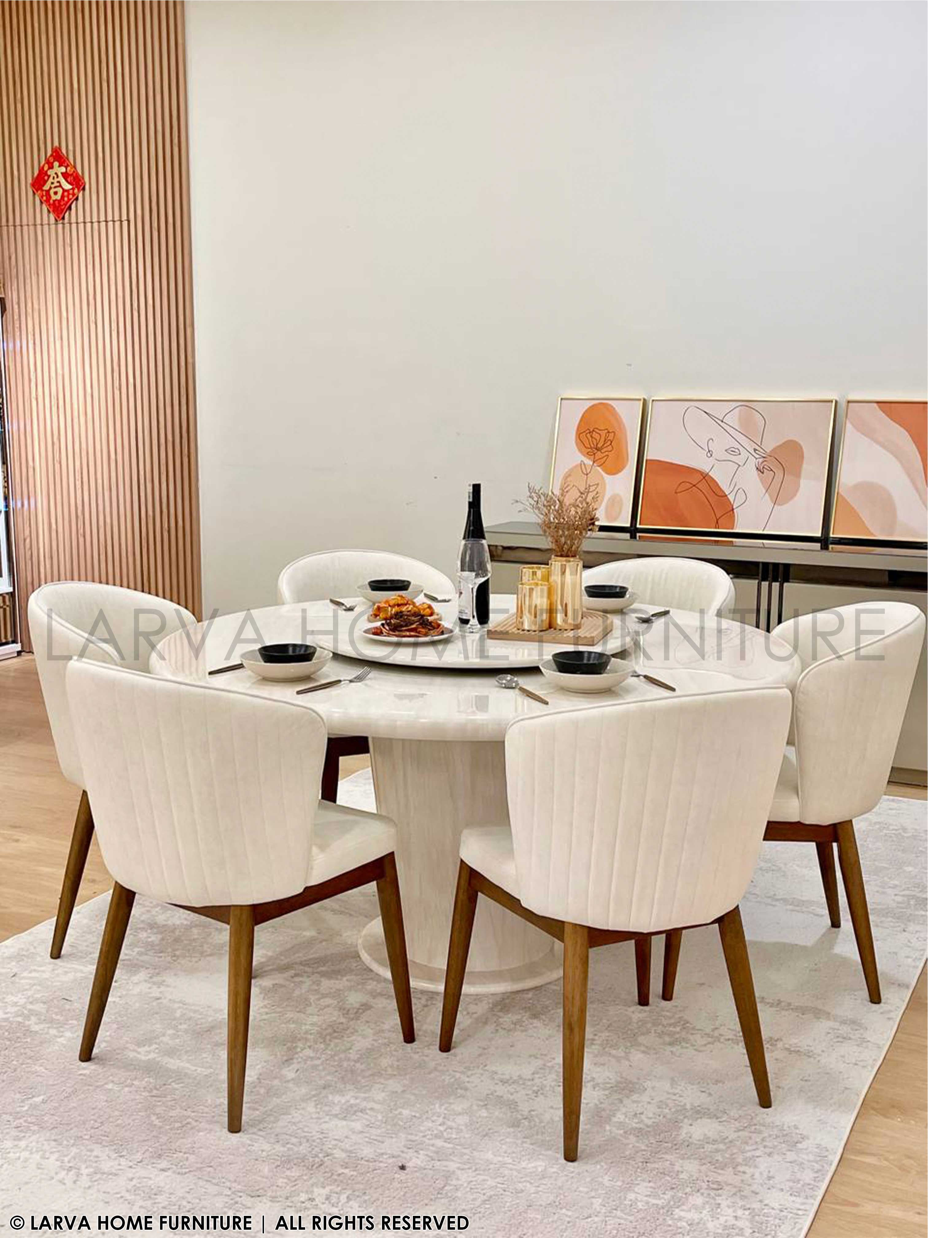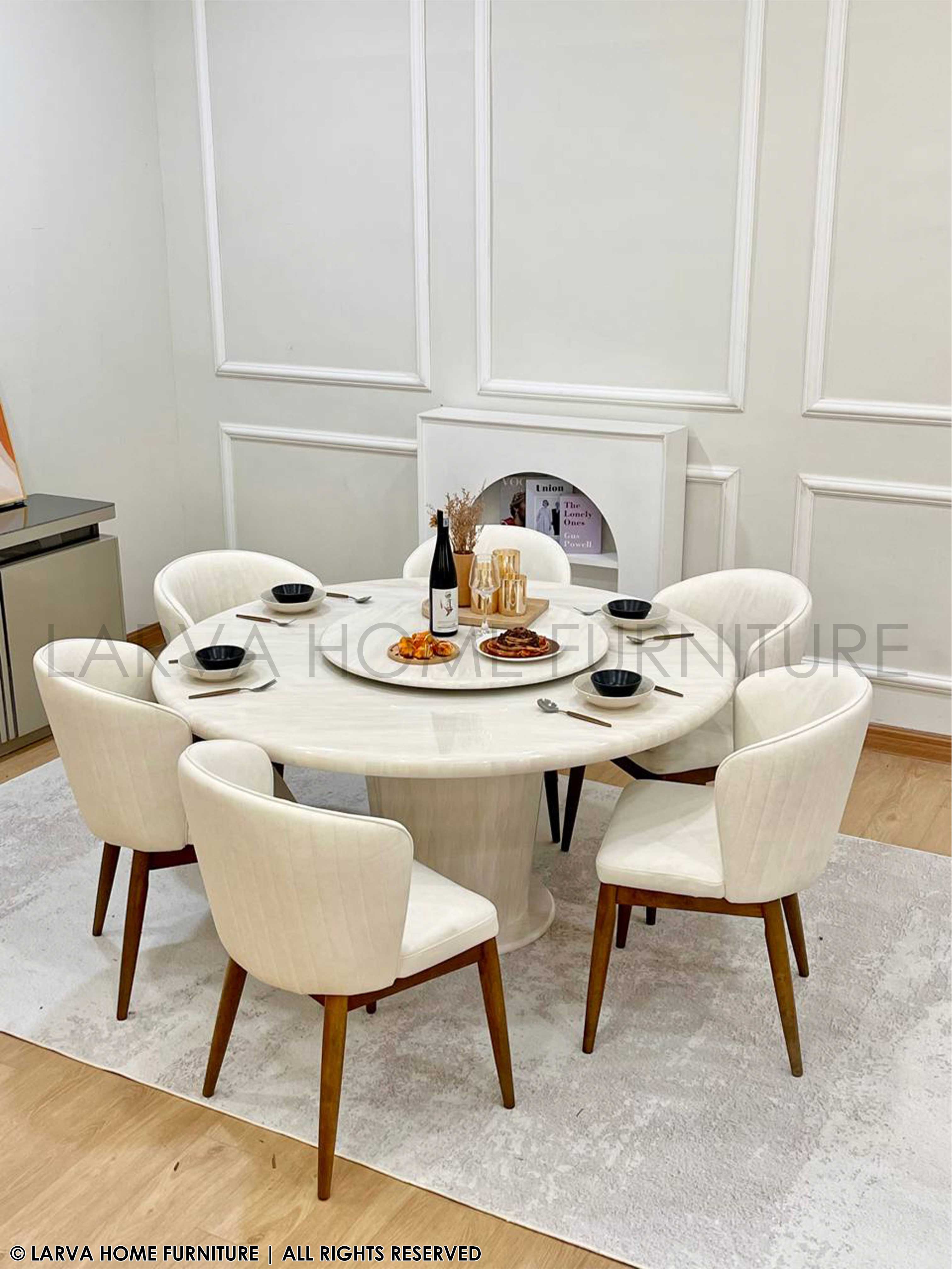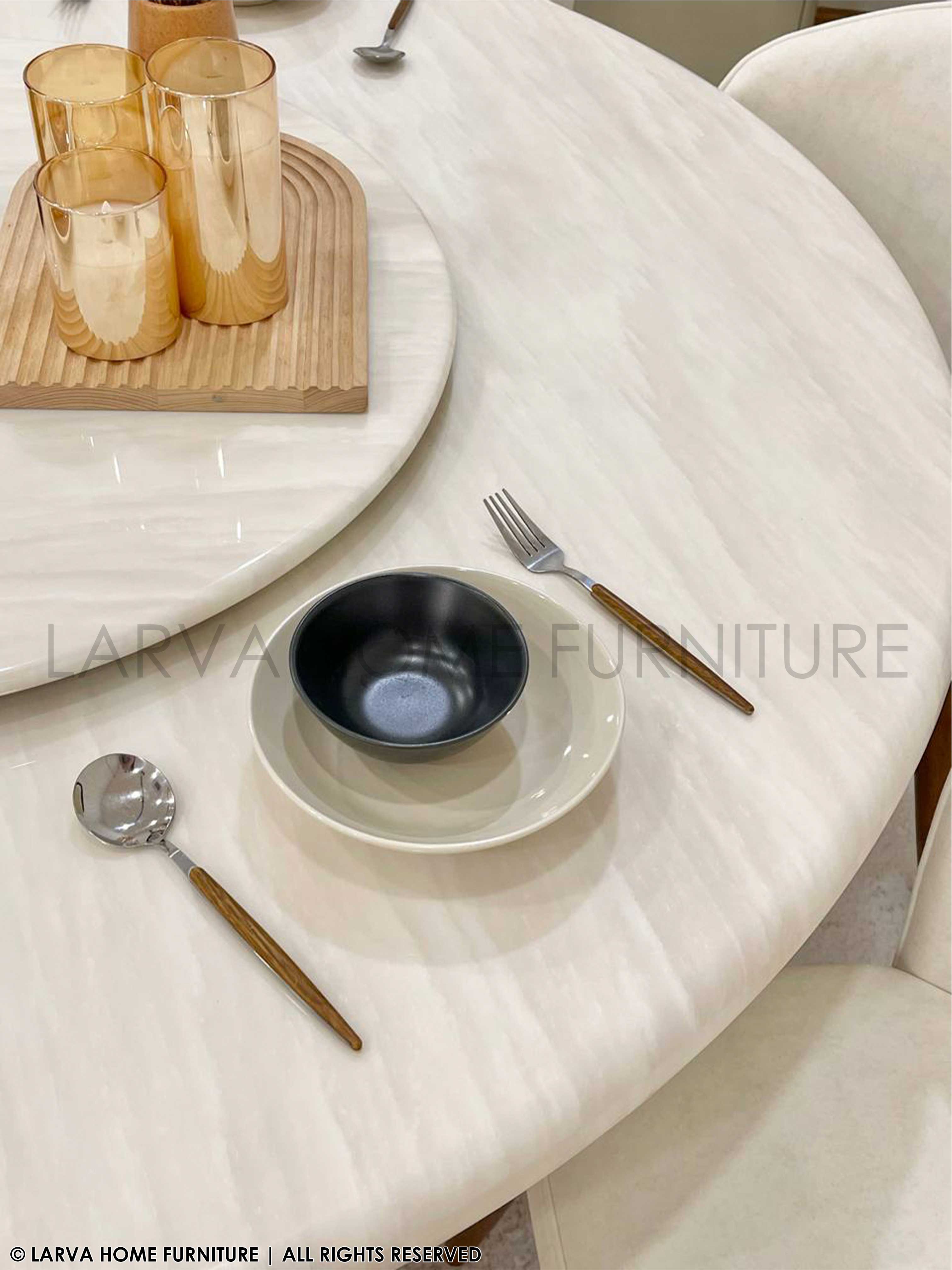 A statement of elegance and modern refinement, this marble Glays Dining Table brings a touch of luxury to any dining space. Its beautifully polished marble tabletop rests atop a solid pedestal base, creating a perfect balance between strength and sophistication. The natural veining of the marble adds a unique character and timeless charm, making every piece one of a kind. Ideal for contemporary or minimalist interiors, this table transforms everyday meals into a refined dining experience, blending durability with effortless beauty.