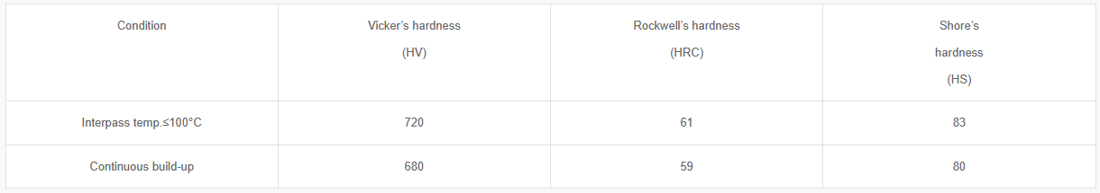 - High hardness is attainable with only one layer of weld metal. The impact resistance is inferior