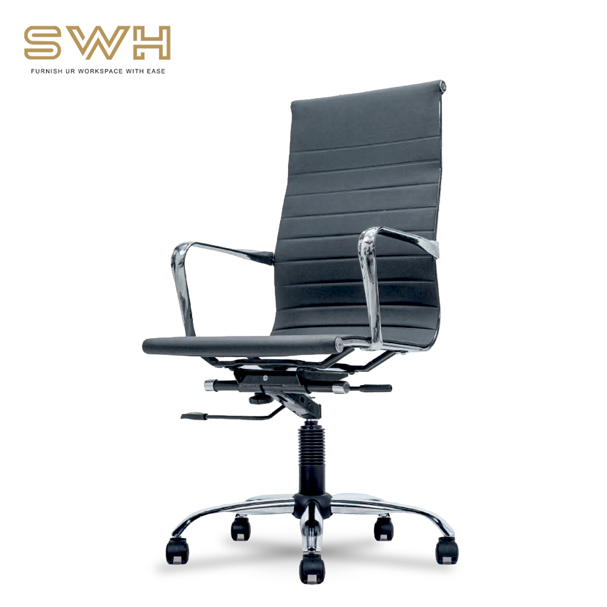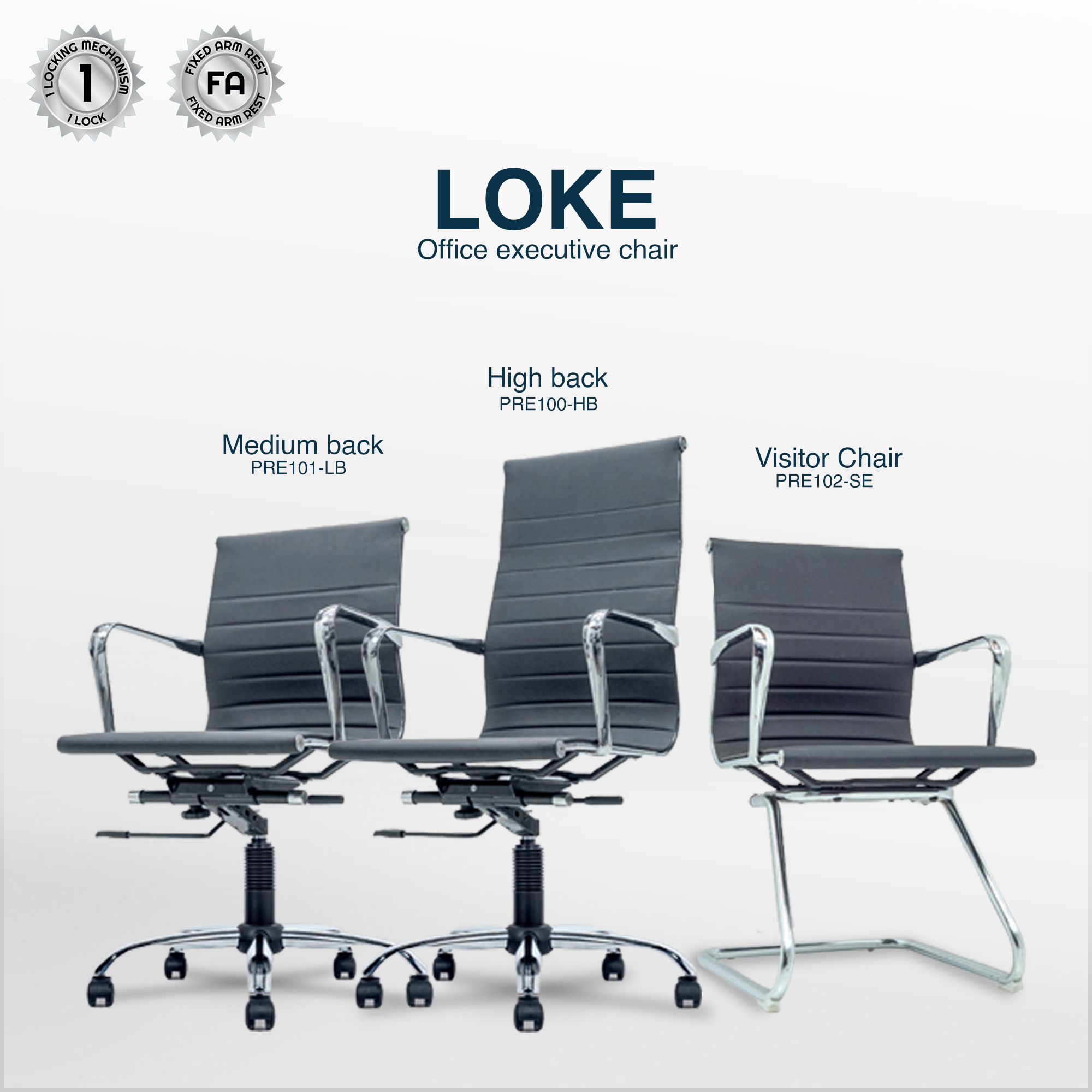 The LOKE Office Executive Chair offers sleek modern styling combined with executive-level comfort. With chrome accents, PU leather upholstery, and a strong steel base, this collection is ideal for boardrooms, executive offices, and visitor seating areas. Available in high back, medium back, and visitor chair variants for a cohesive office design.