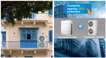 The compact, slim designed outdoor unit can easily be installed on a balcony, realizing complete system installation within each floor. Which release more useful utilization of the space on the building rooftop.
