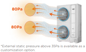 The static pressure of the outdoor unit can be up to 80Pa which facilitates installation of the unit on each floor of high-rise buildings or on balconies.
