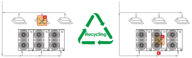 When an indoor unit fails, the refrigerant can be recycled into the outdoor units. When part of the outdoor unit fails, the refrigerant can be recycled into the indoor units and the normal outdoor unit. Two types of refrigerant recycling make the maintenance process easier and more efficient.