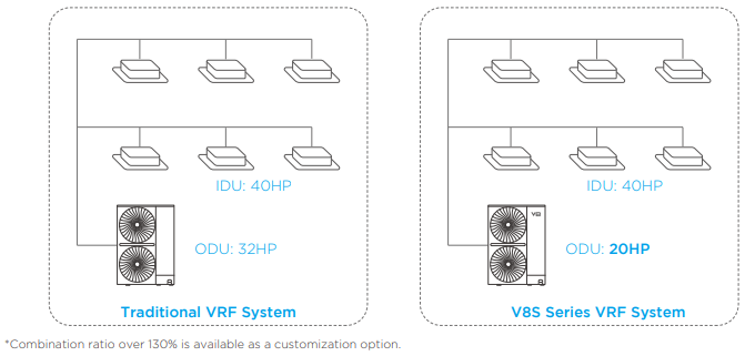 Compared to traditional VRF with combination ratio of 50-130%, the V8S Series VRF can be extended to 50-200%, and the wider combination ratio allows for more flexible system configuration. The larger combination ratio can be applied to long-term part-load operation scenarios, allowing for further reduction in installation costs.