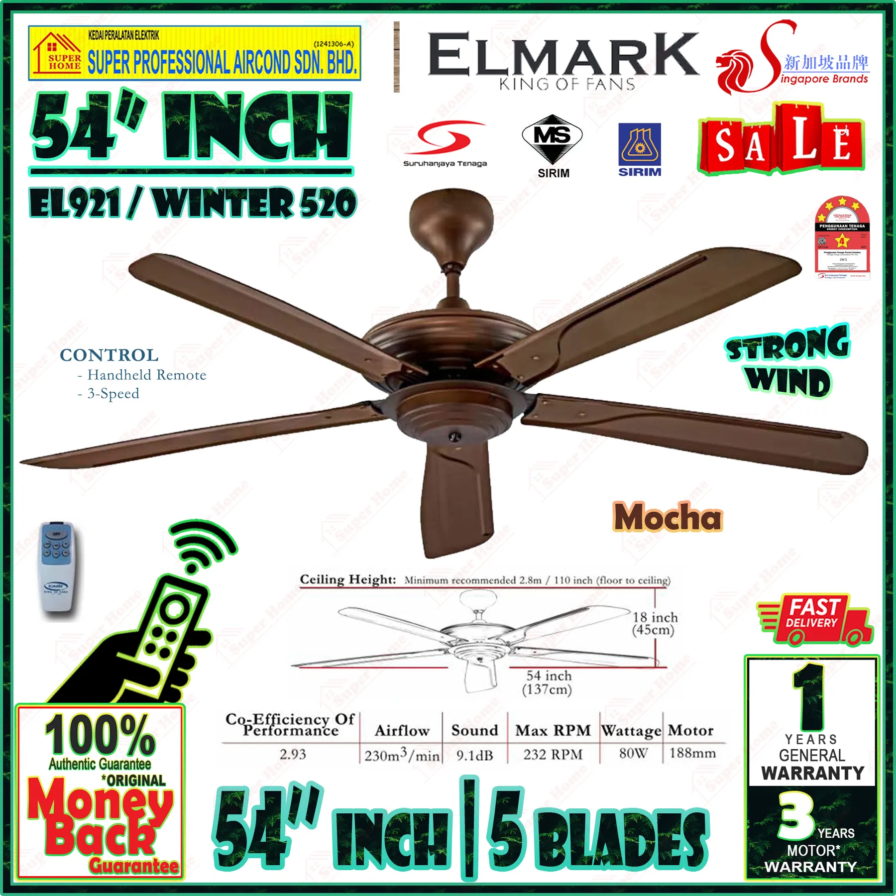 Elmark Ceiling Fan EL921 54 inches Remote Control 5 Blades Ceiling Fan Winter 520 Mocha