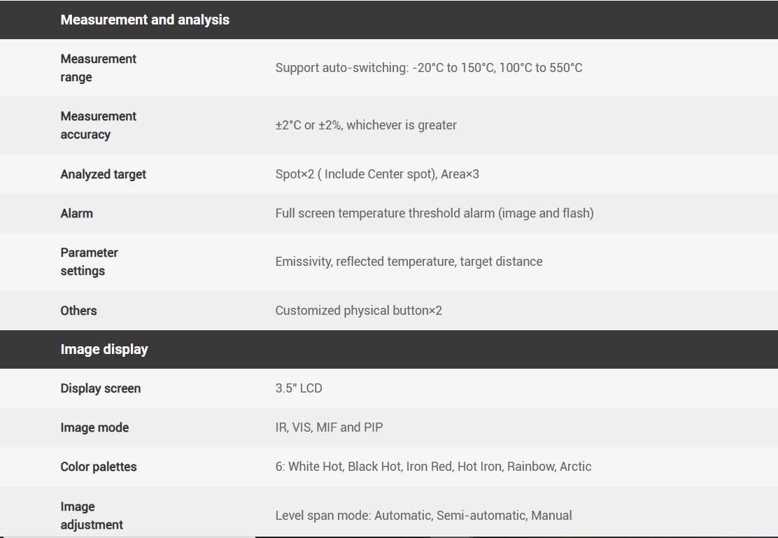 The PF Series pocket-sized thermal camera is a non-contact inspection tool for diagnosing problems and finding hidden deficiencies of electrical equipment, thanks to its 256 × 192 pixel infrared detector, -20°C to 550°C temperature range, 5 MP visible light camera and 3.5-inch LCD touchscreen. The extraordinary thermal imaging detail, easy operation and built-in Wi-Fi allow users to quickly and easily share the professional reports that document the problem.