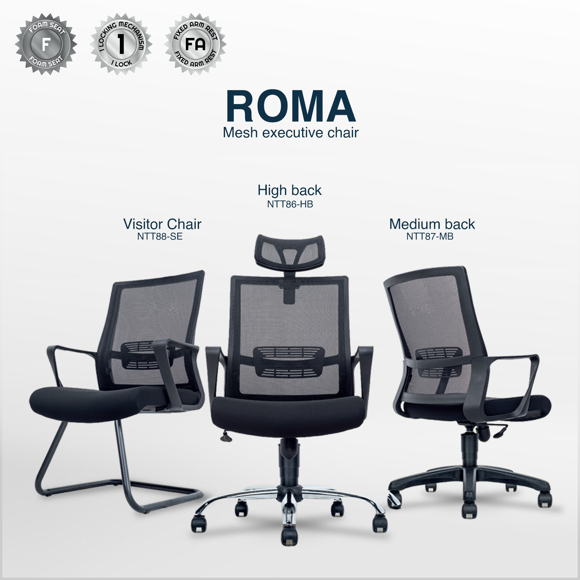 The ROMA Mesh Executive Chair Series blends ergonomic comfort, breathable design, and modern styling. Crafted with premium materials and high-density moulded foam, ROMA ensures superior comfort and long-lasting durability — ideal for executive offices, workstations, conference rooms, and visitor areas.