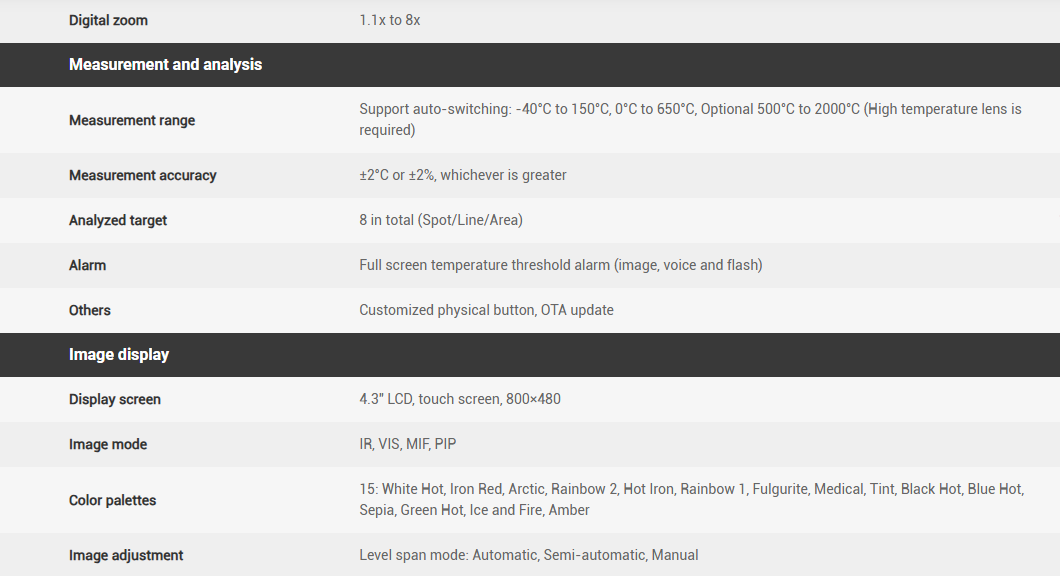 Temperature measurement range -40℃ to 650℃, up to 2000℃ (with high-temperature lens)