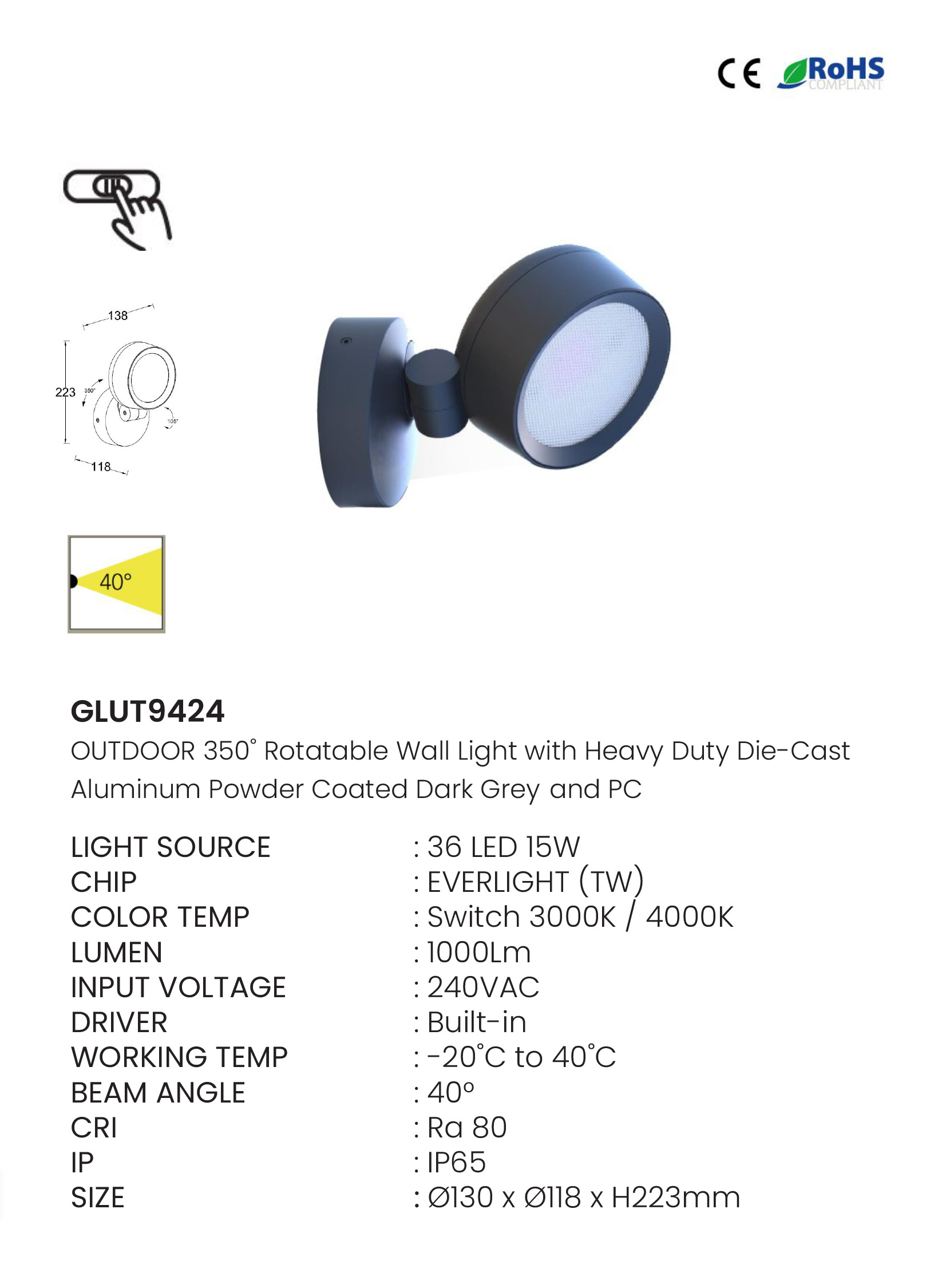 OUTDOOR 350° Rotatable Wall Light (GLUT9424)