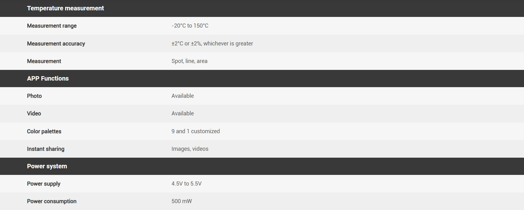 Industrial-class accuracy of ±2°C for temperature measurement, up to 3 spots, 1 line and 2 areas of subjects to be analyzed simultaneously; newly upgraded APP view for conventional temperature measurement, which shows temperature of subjects more intuitively without interference with each other.