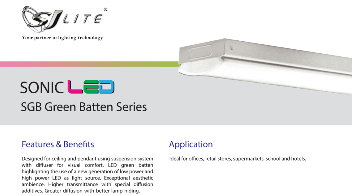 SJLITE SGB SONIC SERIES SURCAE LED GREEN BATTEN 240V IP20 CRI80 [2FEET/4FEET] [23W/34W/46W/68W] [2400LM/3400LM/4700LM/6650LM] [3000K/4000K/6500K] [30,000HRS/50,000HRS]