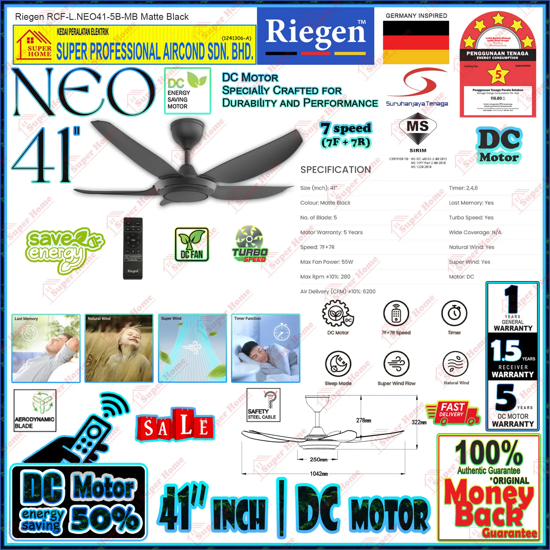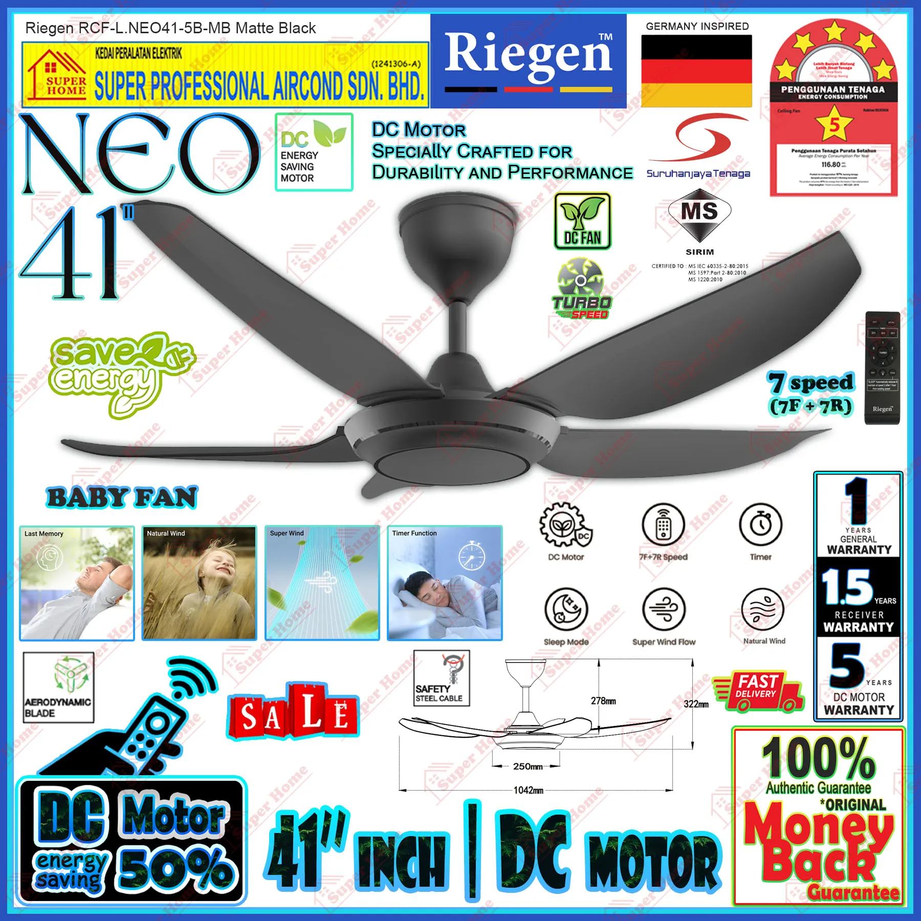 Specifications of Riegen Baby Fan NEO 41 RCF-L.NEO41-5B-MB Ceiling Fan with Remote Control 41 Inch 7-Speed DC Motor Ceiling Fan (Matte Black)