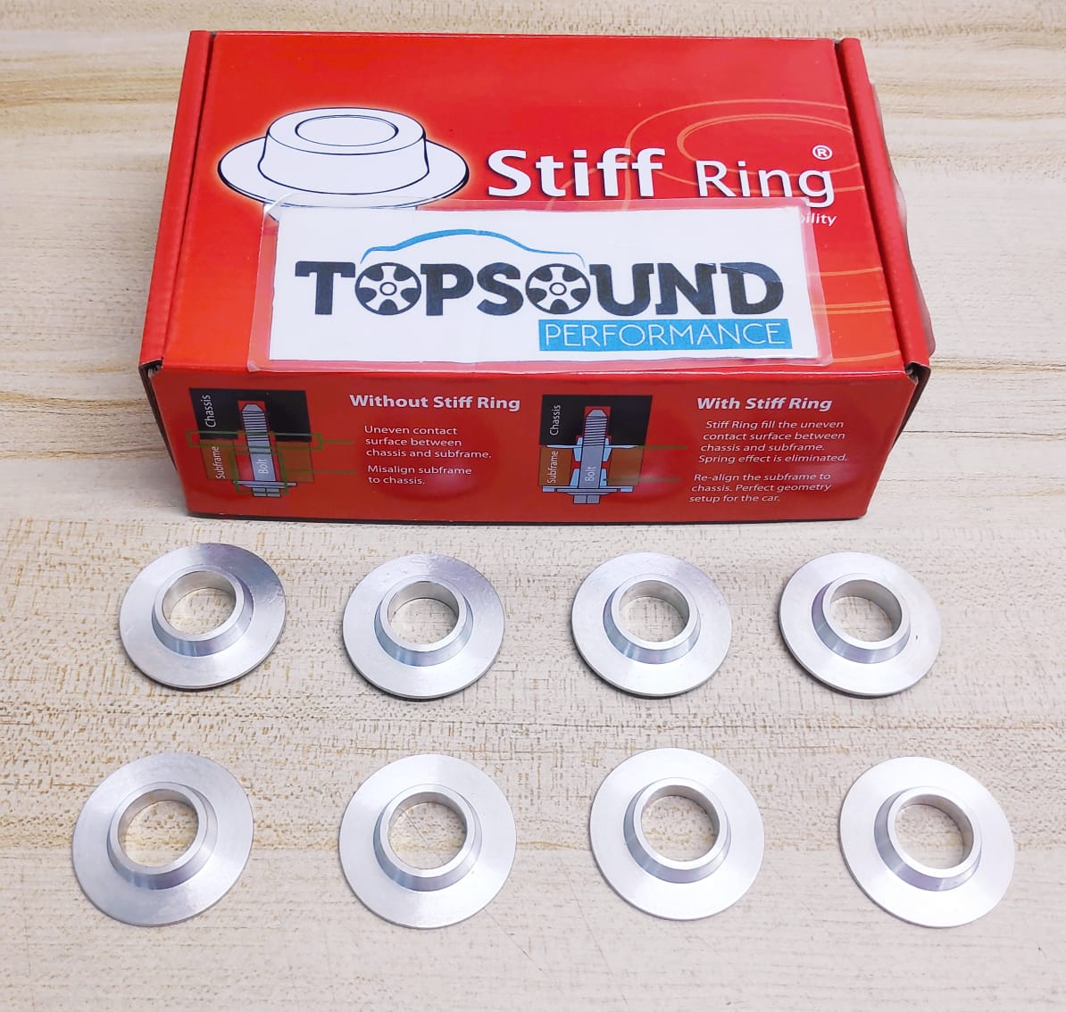 With the Stiff Ring in proper place, the gap is filled up to stop the movement of the sub frame and the car body forever and provide ideal alignment between both, as a result of a perfect geometry setup. Uneven surface is filled up by Stiff Ring, thus, spring effect is remove and resulting a comfortable cabin even further improved the car stability.