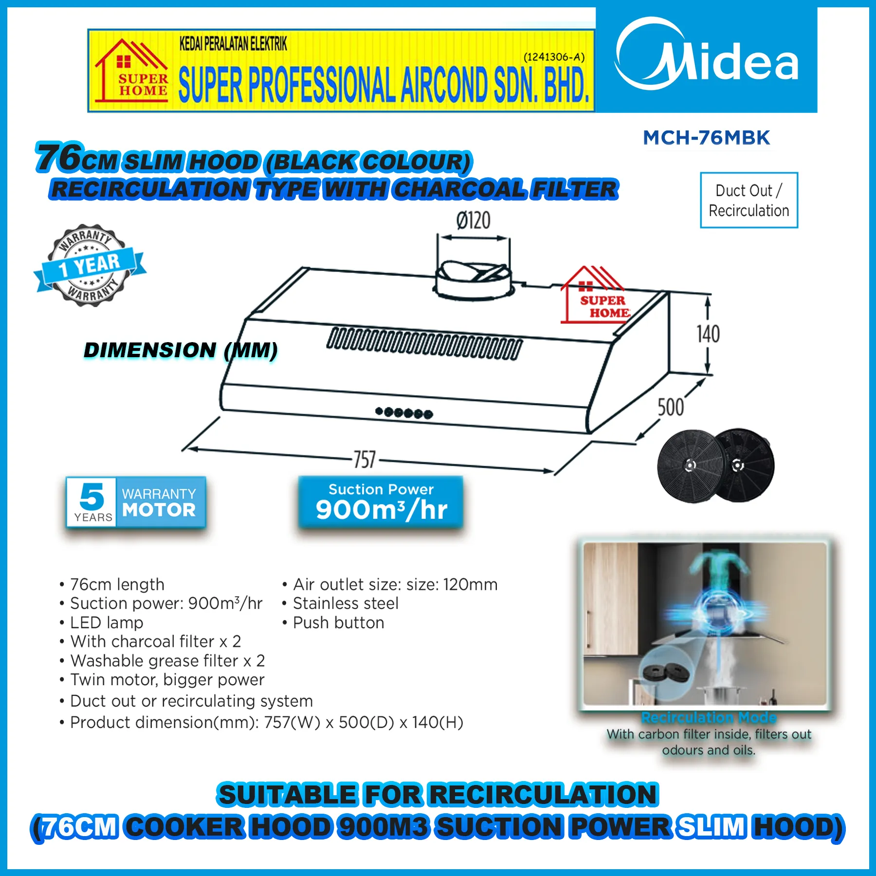Midea Slim Hood MCH-76MBK Black 76cm cooker Hood Recirculating System