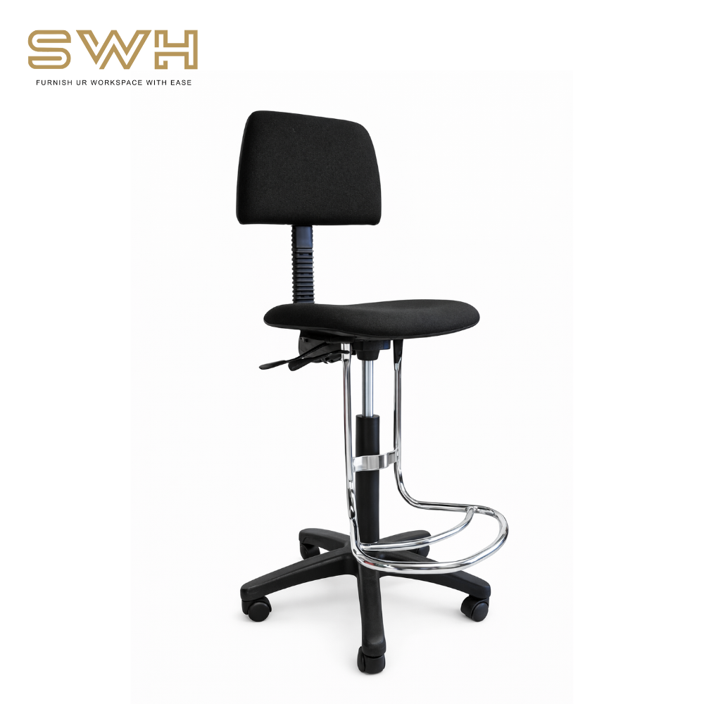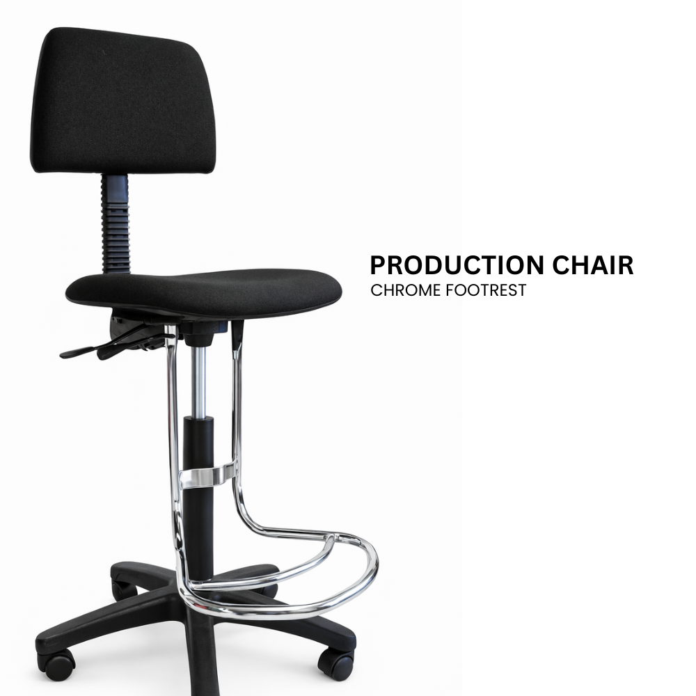 This high stool production chair is designed for elevated workstations commonly found in factories, laboratories, workshops, and production areas. The tall seating height with chrome footrest provides proper support for operators working at counters, benches, or production lines.