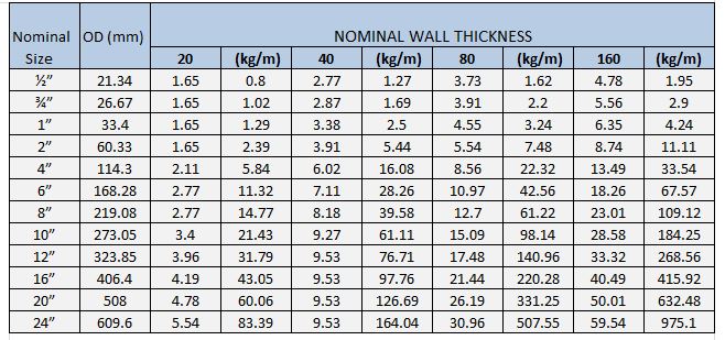 Mild Steel API Pipes/ API L Pipes Sizes / Weight Chart
