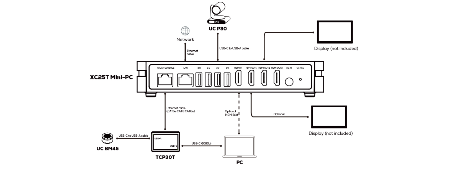 Just one Cat5e/Cat6a cable connects the touch console to the Microsoft Teams Rooms mini PC, enabling flexible placement on the table without distance limits.