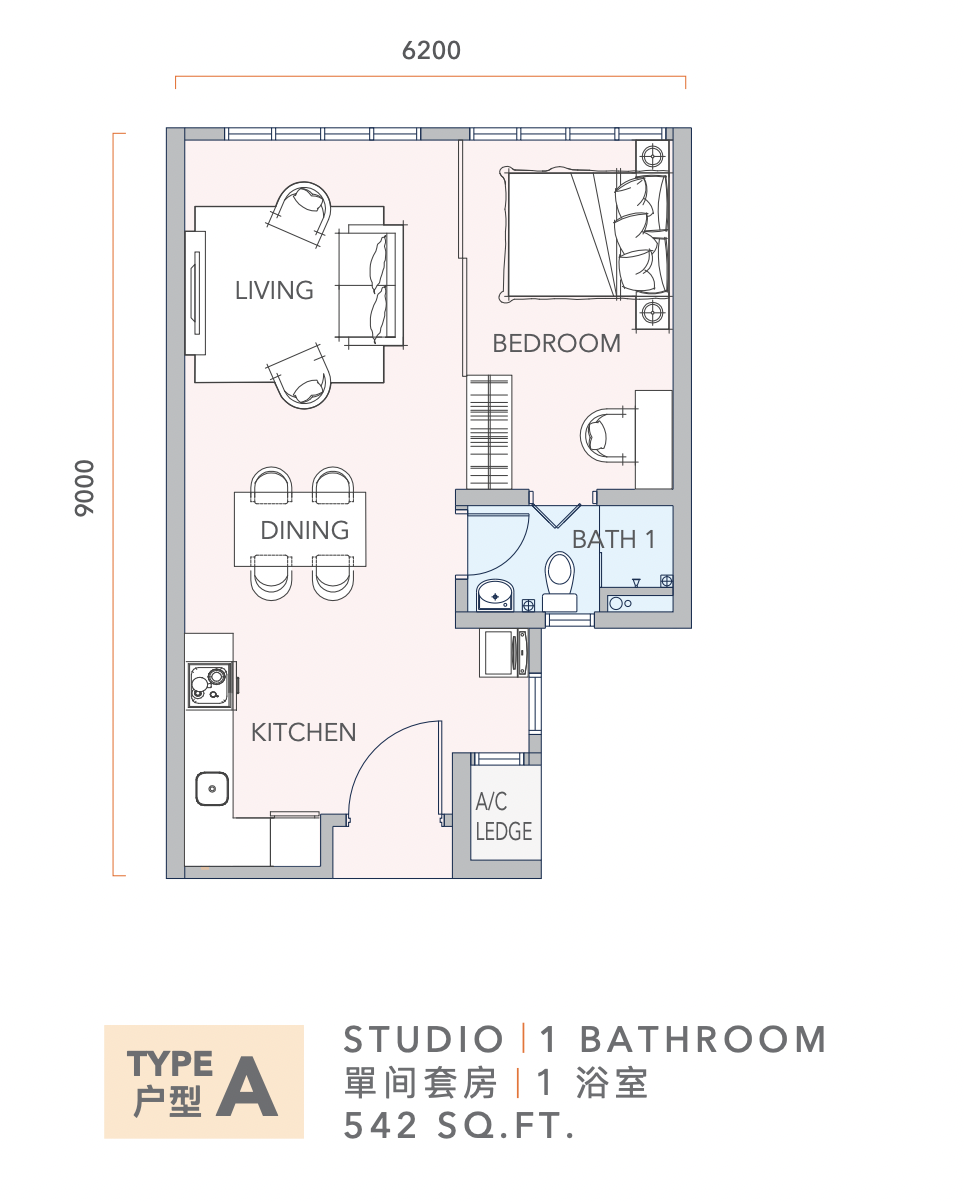 | Unit Types & Sizes | Type A — 1 Bedroom + 1 Bathroom — 590 sq.ft. |
