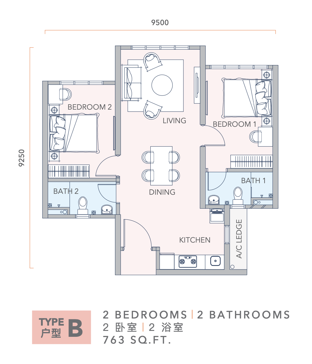 | Type B2 — 2 Bedrooms + 2 Bathrooms (PES) — 850 sq.ft. | |