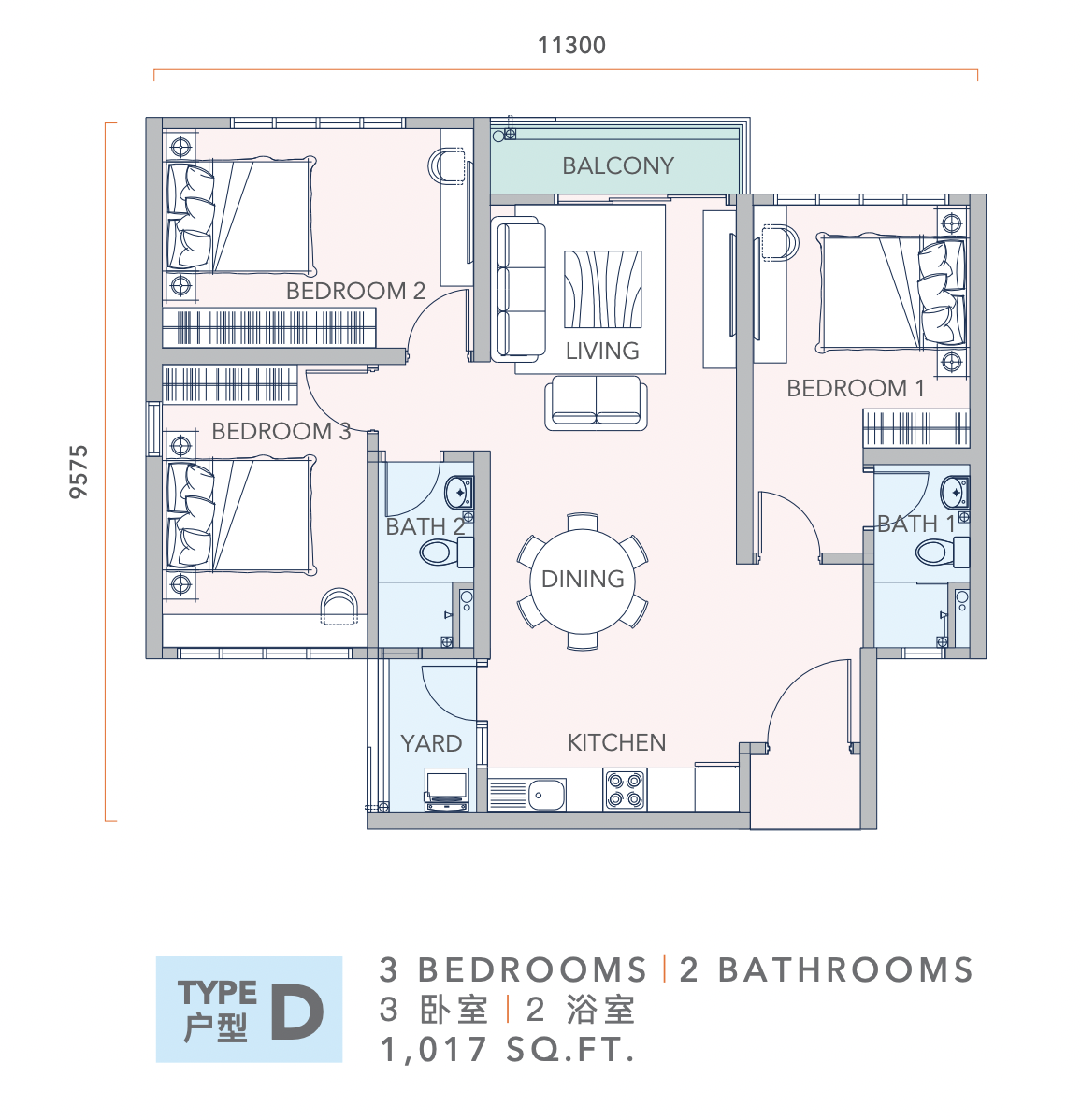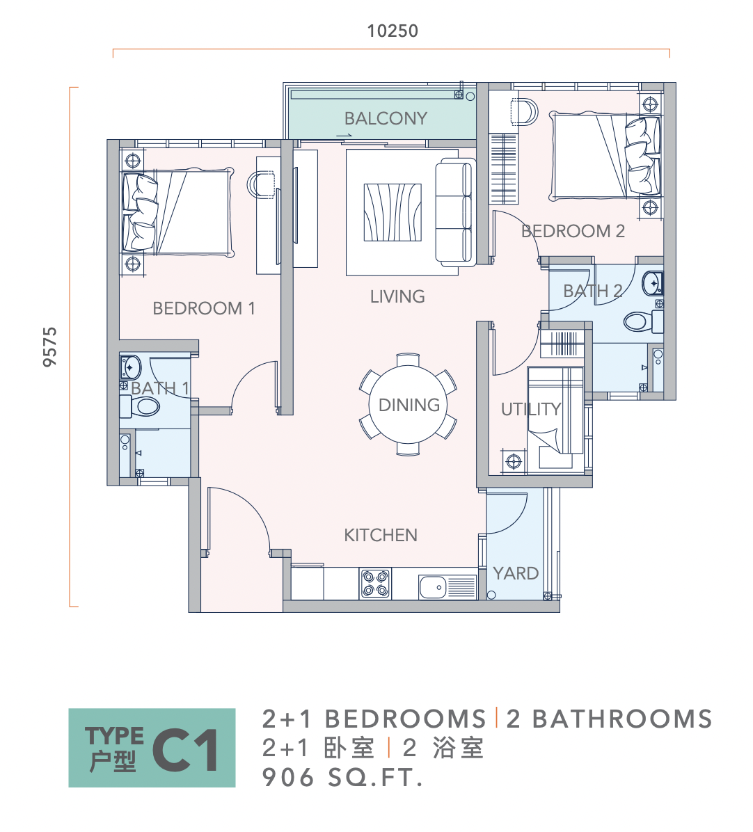 | Type C — 3 Bedrooms + 2 Bathrooms — 954 sq.ft. |