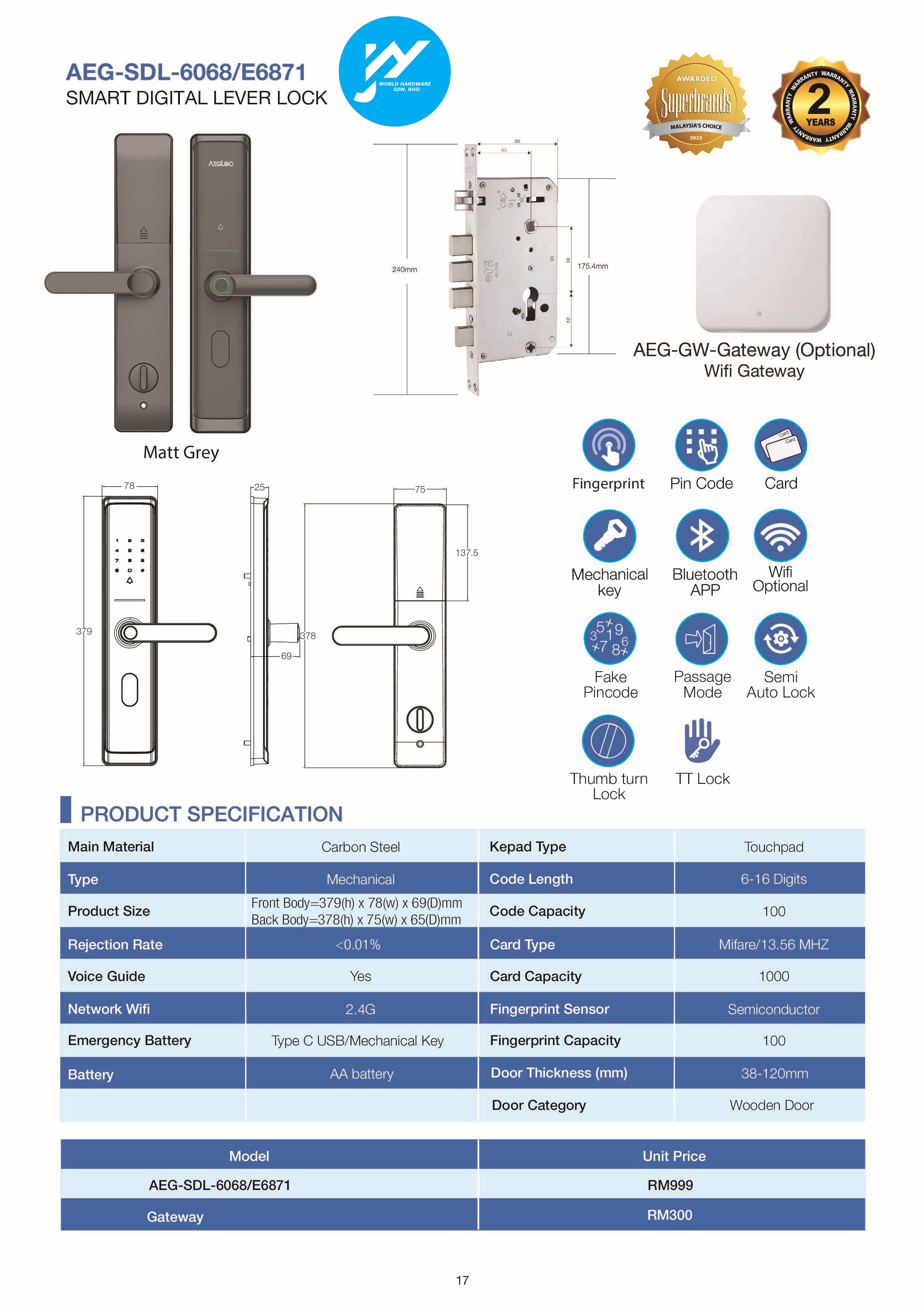Secure your home effortlessly with the AEGLOC AEG SDL 6068/E6871 Smart Door Lock. Unlock via fingerprint, PIN, card, mechanical key, or Bluetooth/WiFi app. Features fake PIN, lockout mode, and remote control for convenience and peace of mind.