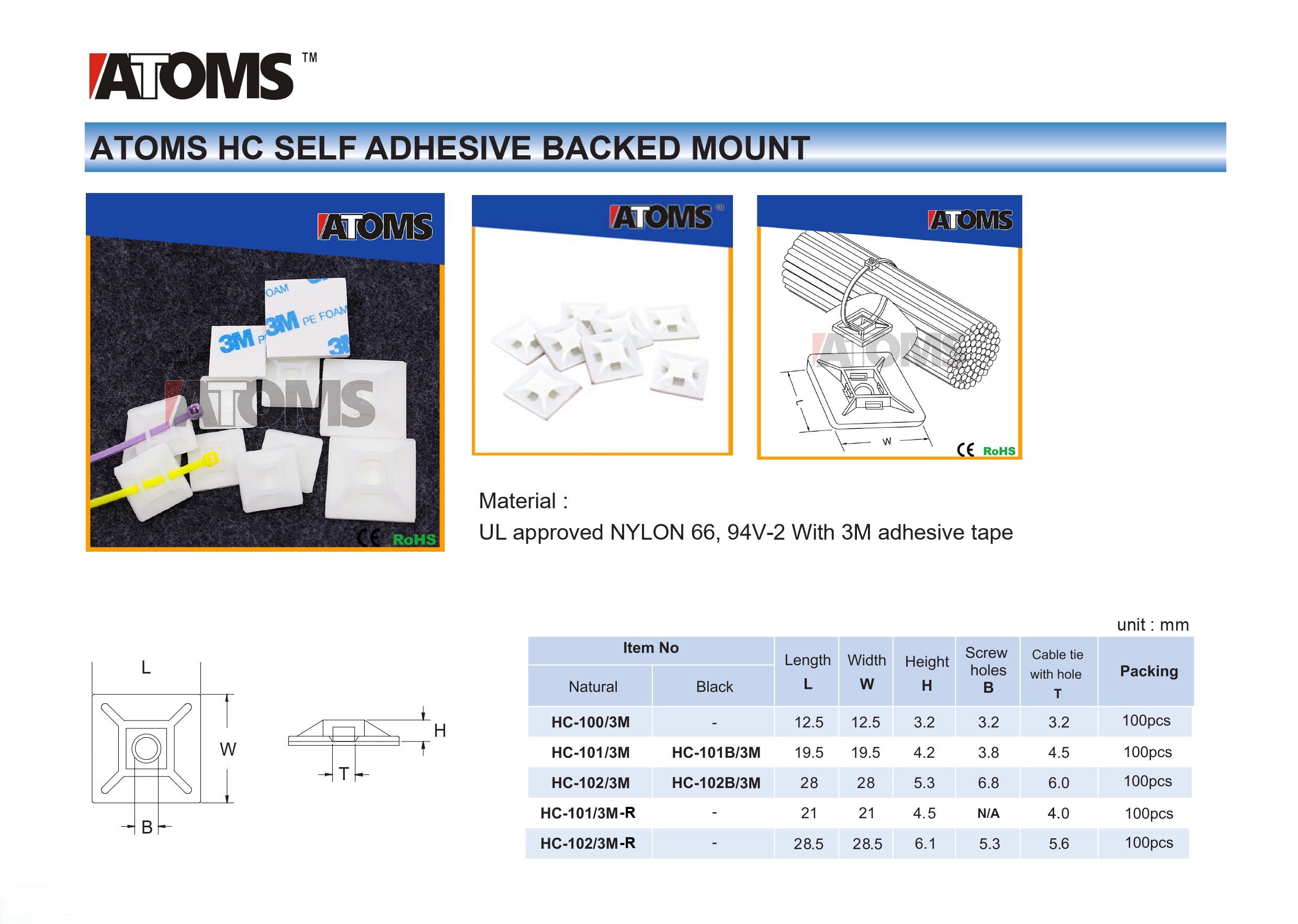 ● SELF-ADHESIVE TIE MOUNTS is designed to support light weight wire bundles when properly applied on any clean, smooth, grease-free surface. For heavy support. mounting hole is provided for