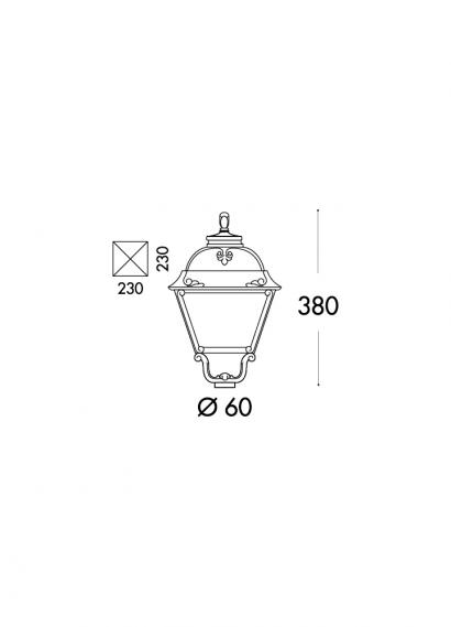 E27 square lantern in classic style, made of shockproof resin material, UV-rays stabilized, rust and corrosion-free. Modular construction suitable for post top, hanging and wall installation. Supplied as optional with TÜV approved, long-life and efficient LED filament lamps suitable for outdoor use. Insulation class II, protection rating IP55.