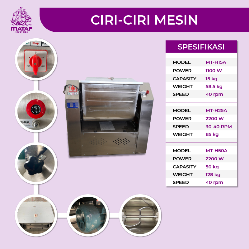 Mesin pengadun in mampu mengadun tepung untuk dijadikan doh. Mesin yang bekerja secara horizontal dengan putaran kuat dan stabil mampu menghasilkan adunan yang sekata. Hasil yang maksimum boleh diperolehi dengan menggunakan air sejuk atau ais. Kelebihan mesin ini ialah pengguna dapat mengadun tepung dengan berat 15kg muatan.