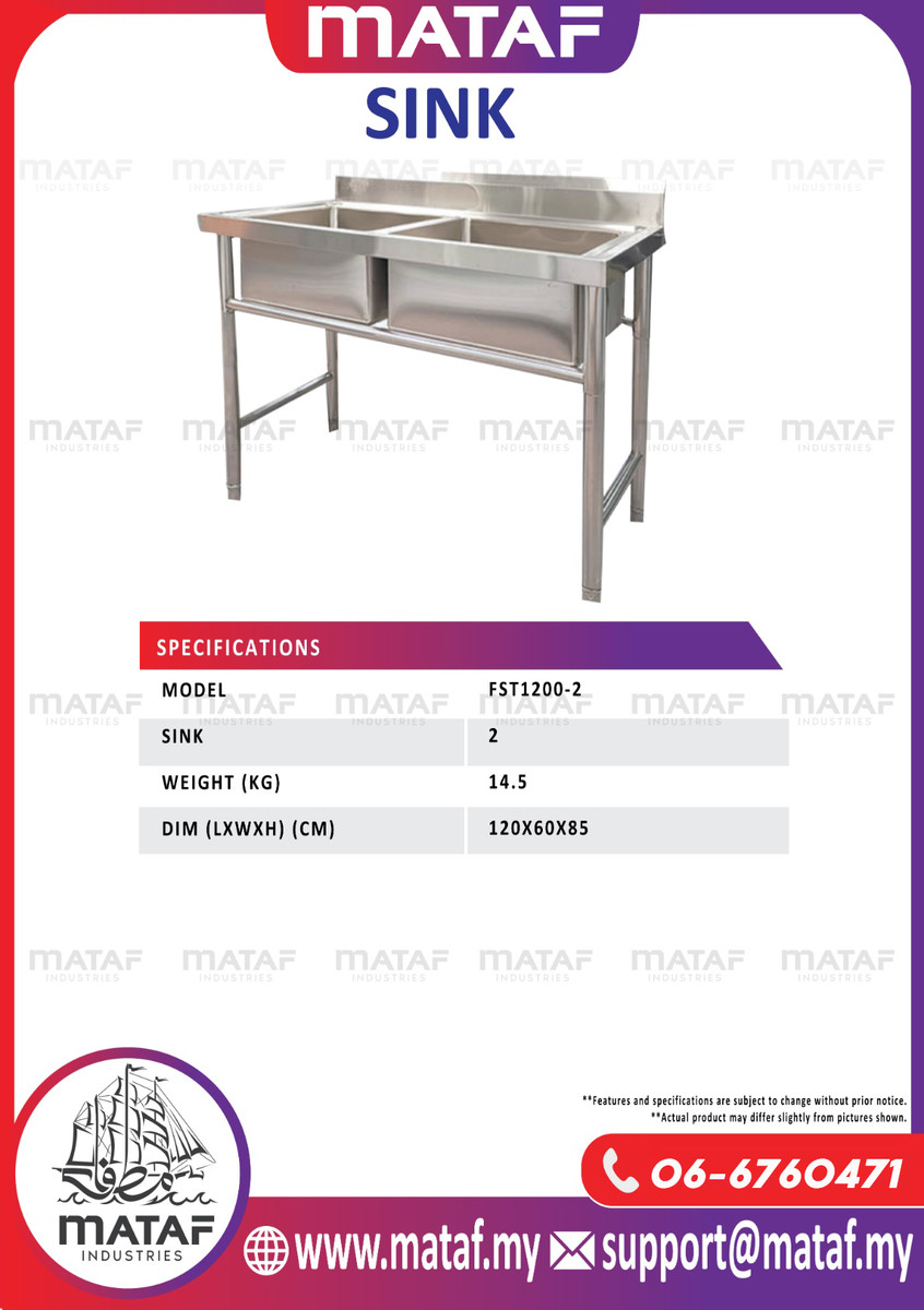 Stainless Steel Commercial Double Bowl Kitchen Sink FST1200-2 Sink :2 Weight (kg): 14.5 Dim (LxWxH) (cm): 120x60x85