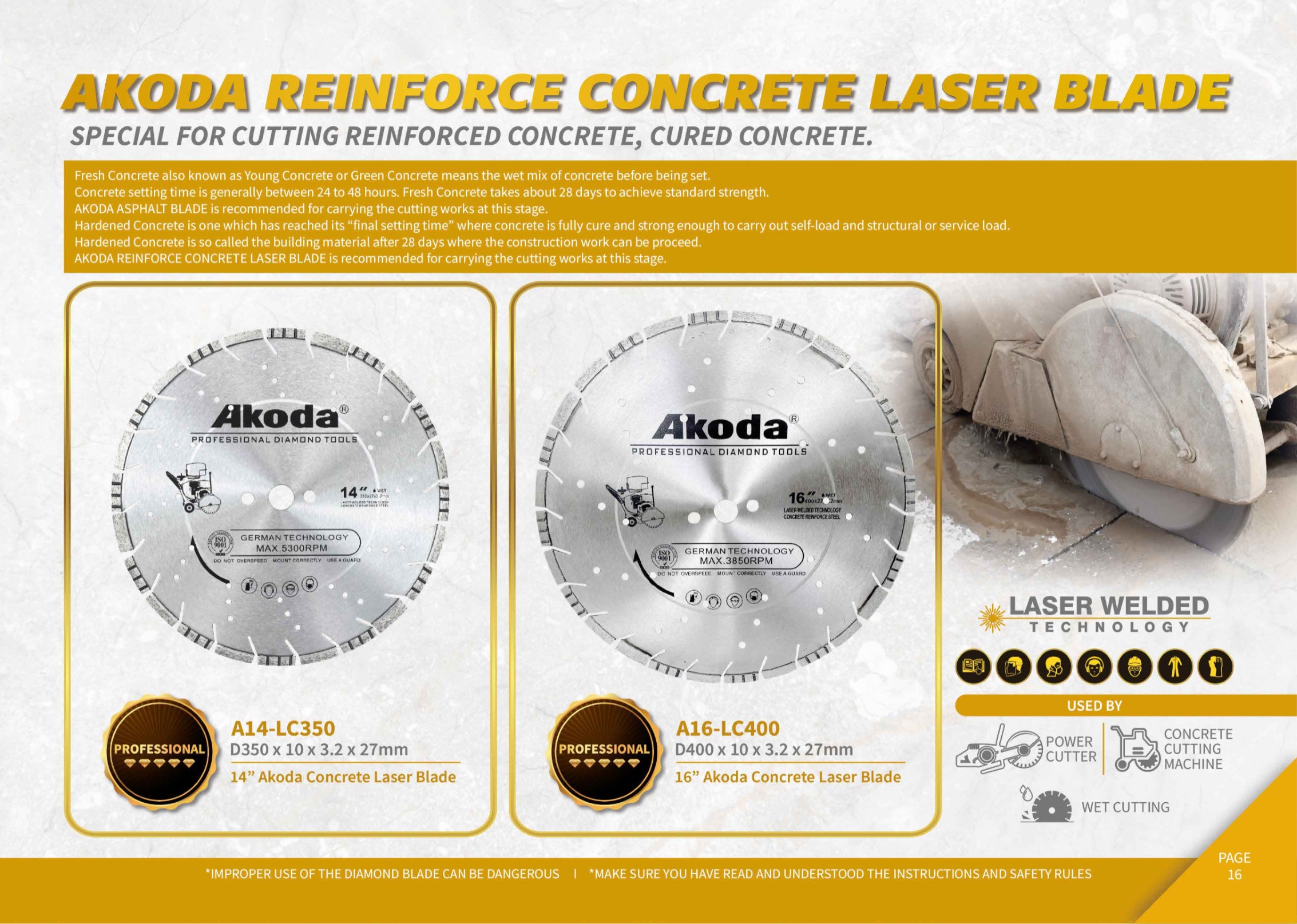 Fresh Concrete also known as Young Concrete Or Green Concrete means the wet mix of concrete before being set. Concrete setting time is generally between 24 to 48 hours. Fresh Concrete takes about 28 days to achieve standard strength. AKODA ASPHALT BLADE is recommended for carrying the cutting works at this stage. Hardened Concrete is one which has reached its “final setting time” where concrete is fully cure and strong enough to carry out self-load and structural or service load. Hardened Concrete is so called the building material after 28 days where the construction work can be proceeded. AKODA REINFORCE CONCRETE LASER BLADE is recommended for carrying the cutting works at this stage.