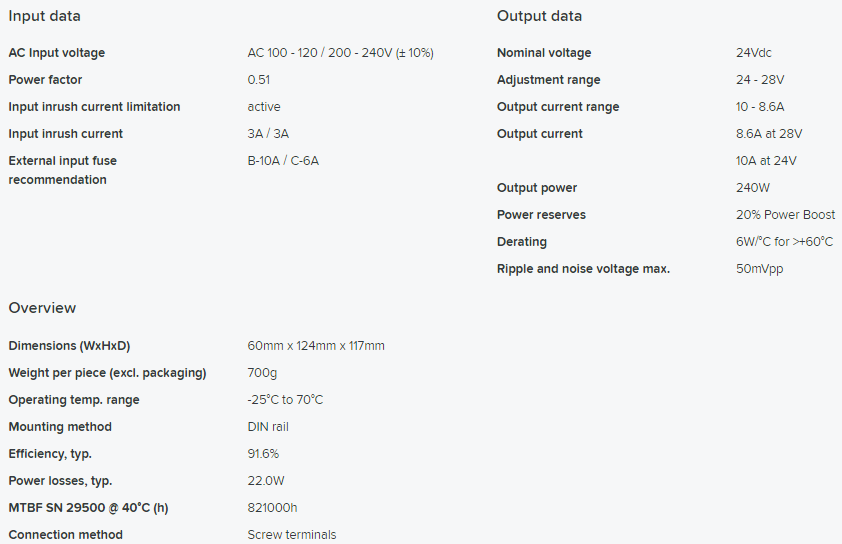 PULS CS10.241 DIN RAIL POWER SUPPLIES INPUT: AC100~120/200~240V OUTPUT: 24VDC/240W/10A