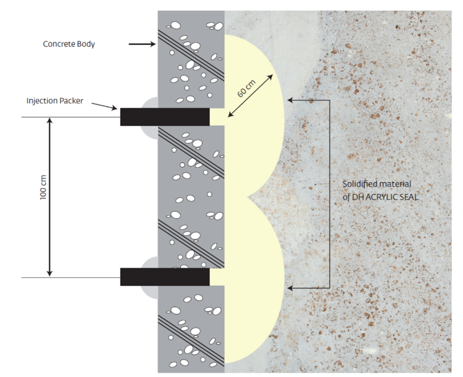 NCL DH-50 ACRYLIC SEAL is an acrylic-based, low viscosity waterproofing resin and curtain grouting material designed to stop water leakages especially underground infrastructure in permanent water contact such as tunnel, subway, basement etc. Generally, the acrylic resin is injected behind leaking concrete structure into the soil layer. The reaction time of the material is controllable with the addition of Catalyst to cope with different site condition. Once cured, NCL DH-50 ACRYLIC SEAL forms a highly elastic water-impermeable layer which prevent concrete structure from damages caused by external groundwater infiltration.
