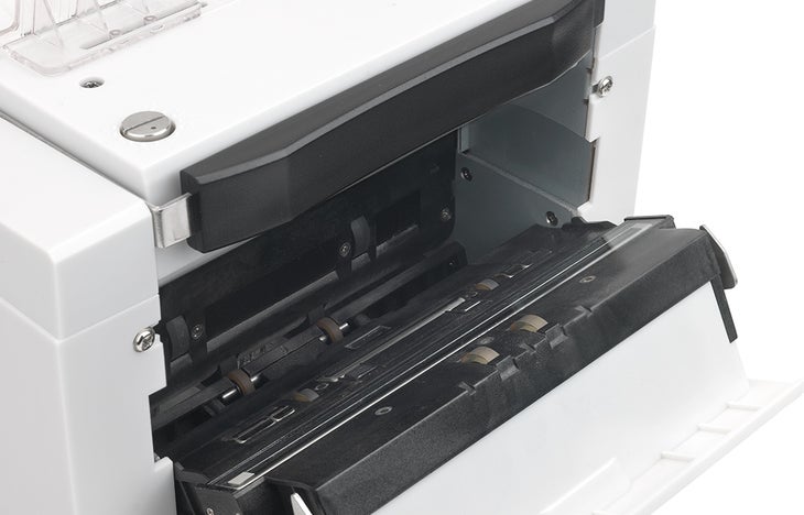 To keep your 2885-S in shape and ensure optimal counting and verification results at all times, regular cleaning is required. The back panel of the 2885-S can be opened in such a way that removal of any excess dust and dirt from the internal sensors and feeding mechanism can be done within seconds.