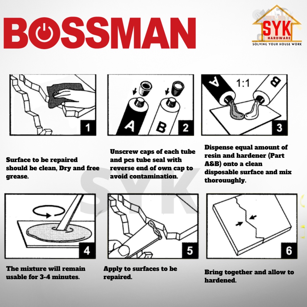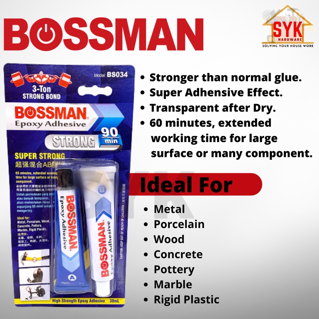 Product specification about Bossman BS034 3 Ton Super Strong Adhesive Glue Epoxy Strong (Super Strong) Gam Kayu Plastic Kaca 30ml