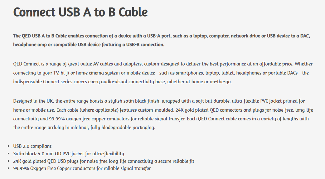 24K gold plated QED USB plugs for noise-free long-life connectivity a secure reliable fit
