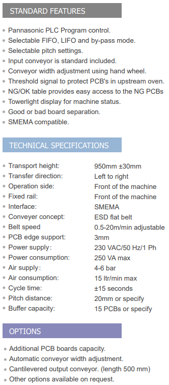 The NG OK vertical buffer is designed to buffer NG and OK board after inspection machine (AOI / SPI) and pass a OK board to next process.NG board will go to the upper conveyor for visual check.