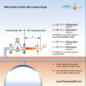 However, consider when installing inline deflagration flame arrester that the distance from ignition source to inline deflagration flame arrester is limited.