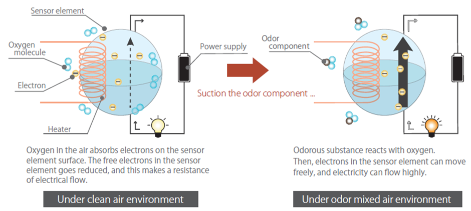 The oxygen in the air absorbs the electrons on the sensor surface when it is heated at high temperature. It becomes a resistance of electrical flow in the sensor element. If an odor component with a reducing potential comes to the sensor under this condition, the electrons in the sensor can move freely and the electricity can flow highly. This product reads this voltage difference and displays the odor intensity as the measured value calculated by our original formula.