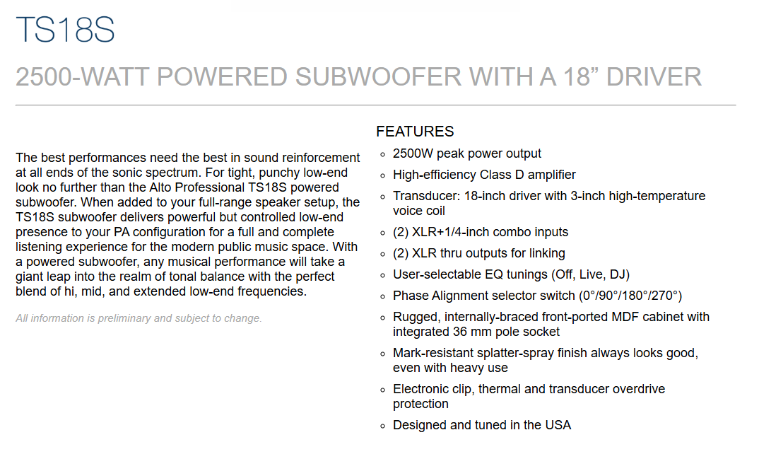 Sound reinforcement needs can change from night to night but the best in the business count on reliable power at their disposal whenever it’s needed. The TS18S is Alto Professional’s most powerful subwoofer yet, packing an incredible 2500 watts of power to make concert halls come alive, night clubs punch and pump, houses of worship lift-up instrumental performances, and more. Thanks to its high- efficiency class D amplifier, TS18S adds the necessary heft and weight to any public performance for a balanced representation of musical artistry in any environment.